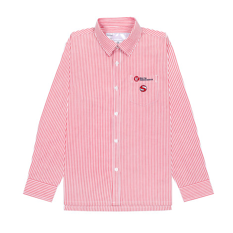 Details: Red stripe, custom-made fabric, mercerised cotton with silky finish for minimal ironing, embroidered logo, button fastenings
